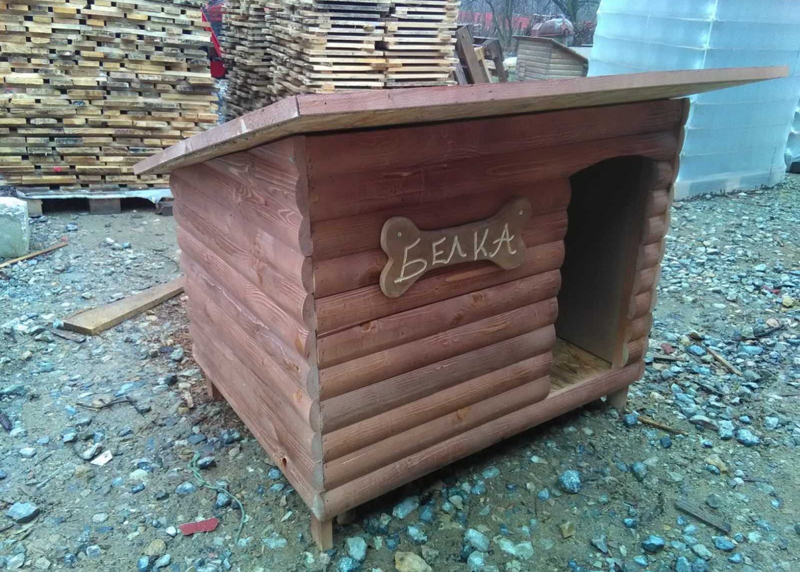 K model je izrađen od čamovih poluoblica debljine 2.5 cm. Sa unutrašnje strane zidovi su izolovani stiroplolom 2 cm, preko stiroplola je lesonit 0.5 cm tako da pas ne može da kida izolaciju. Zid je troslojni i ukupne debljine 5cm. Kucica ima nogice 8cm što onemogućava ulazak kišnice u kućicu i olakšava čišćenje prostora ispod same kućice. Krov je prekriven bordo ili zelenom tegolom po izboru kupca. Kompletan se moze skinuti radi lakseg čišćenja. Kućica je spolja zaštićena sandolinom.